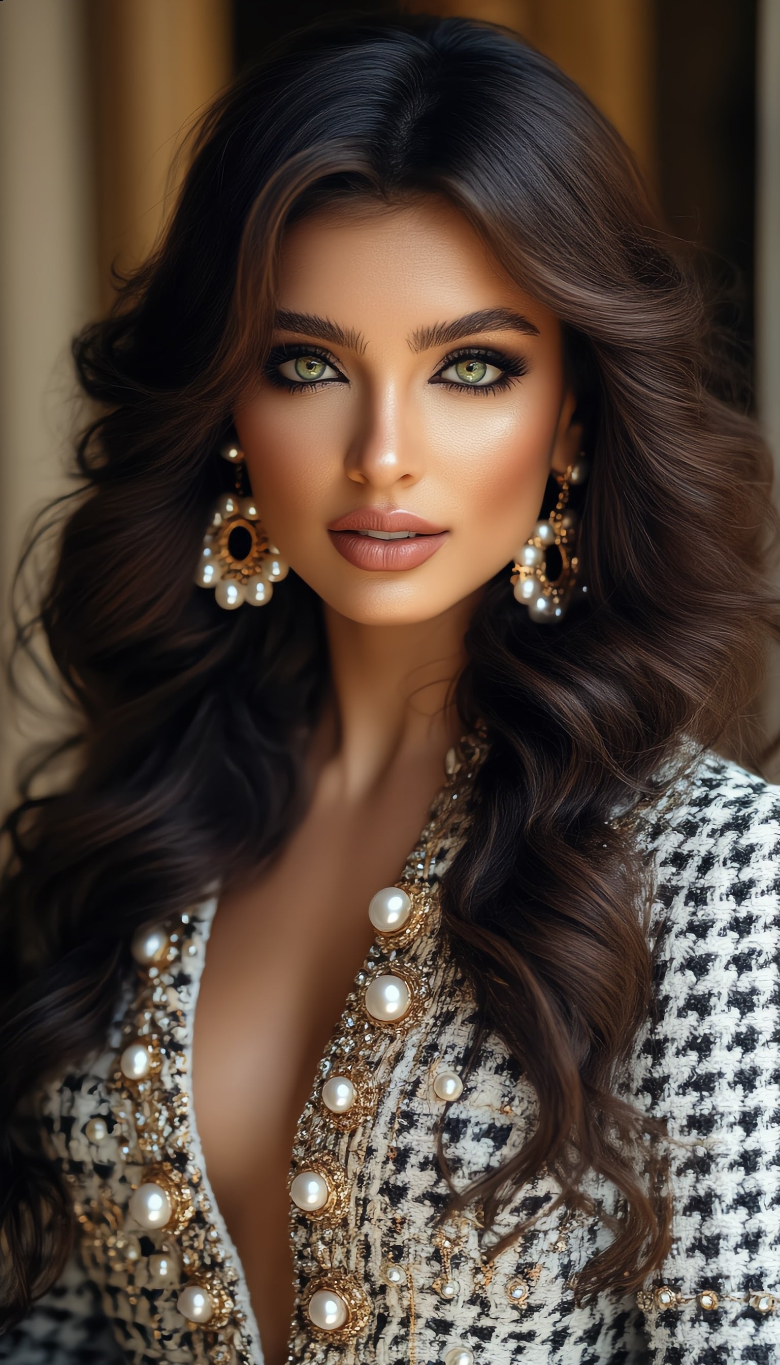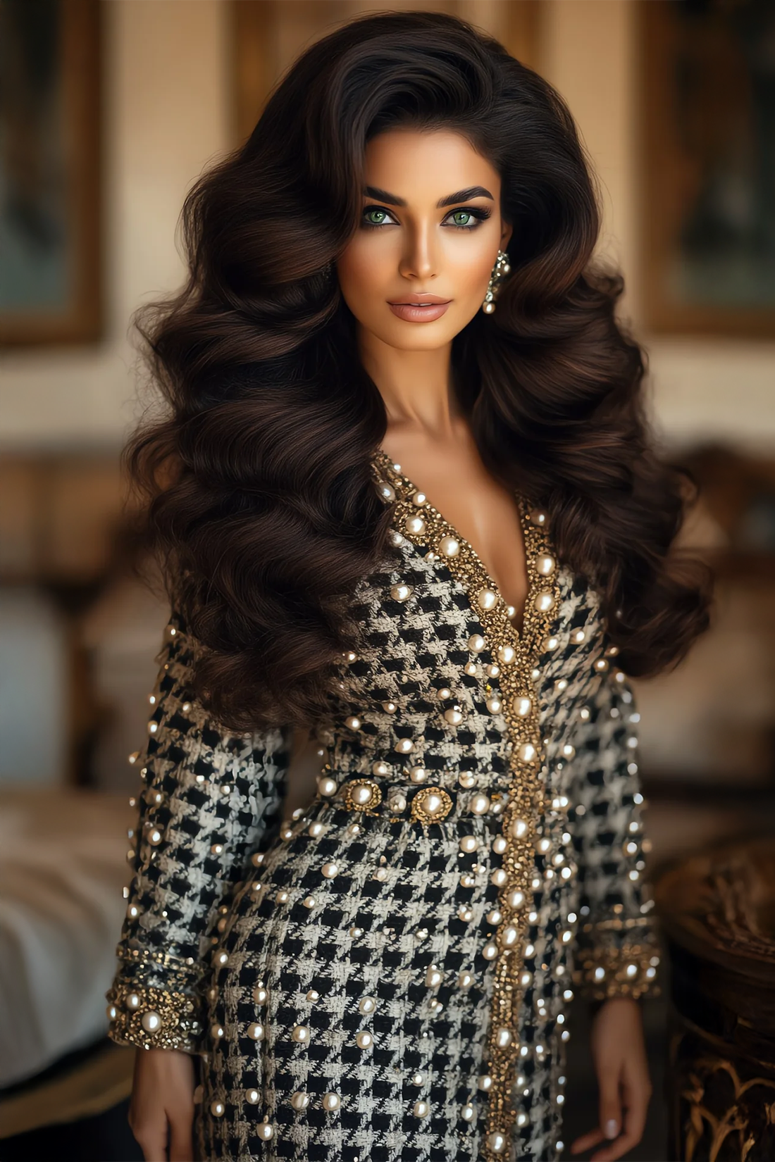 This abaya is created with a textured tweed material in a houndstooth pattern. Fabric can be customised to your liking. Gold and pearl accents complement this piece.