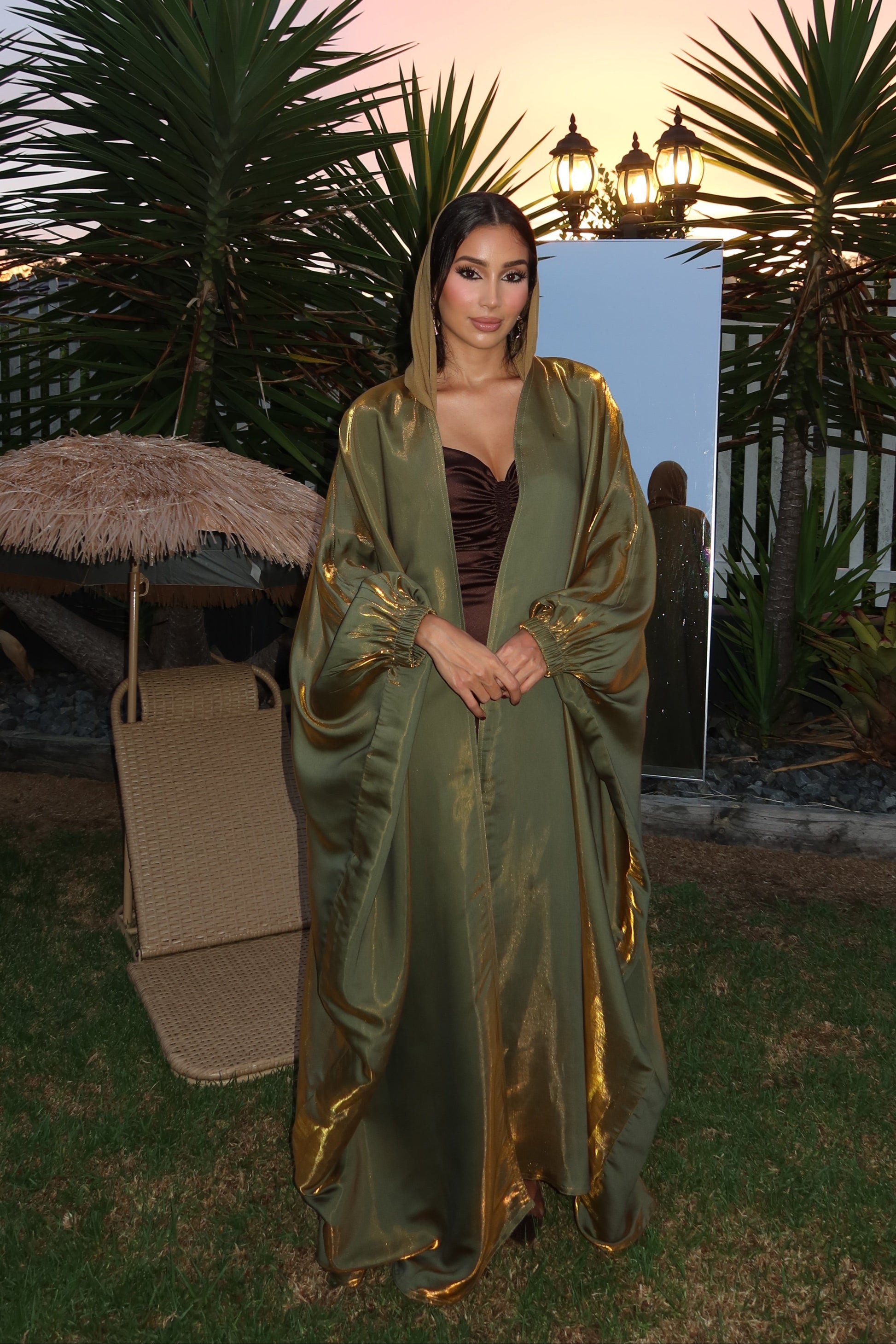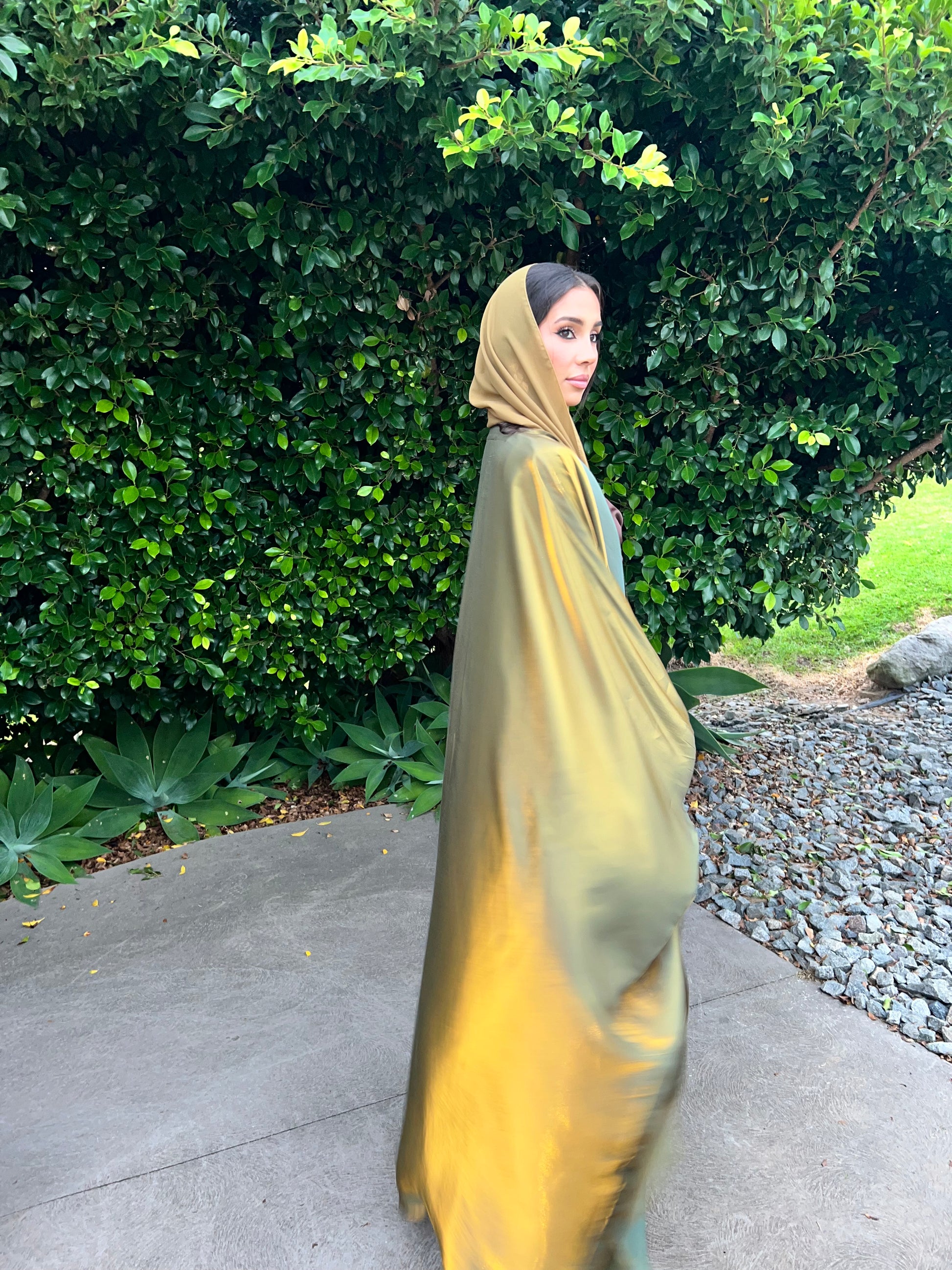 This abaya is created with a sophisticated color combination of metallic sage and gold.