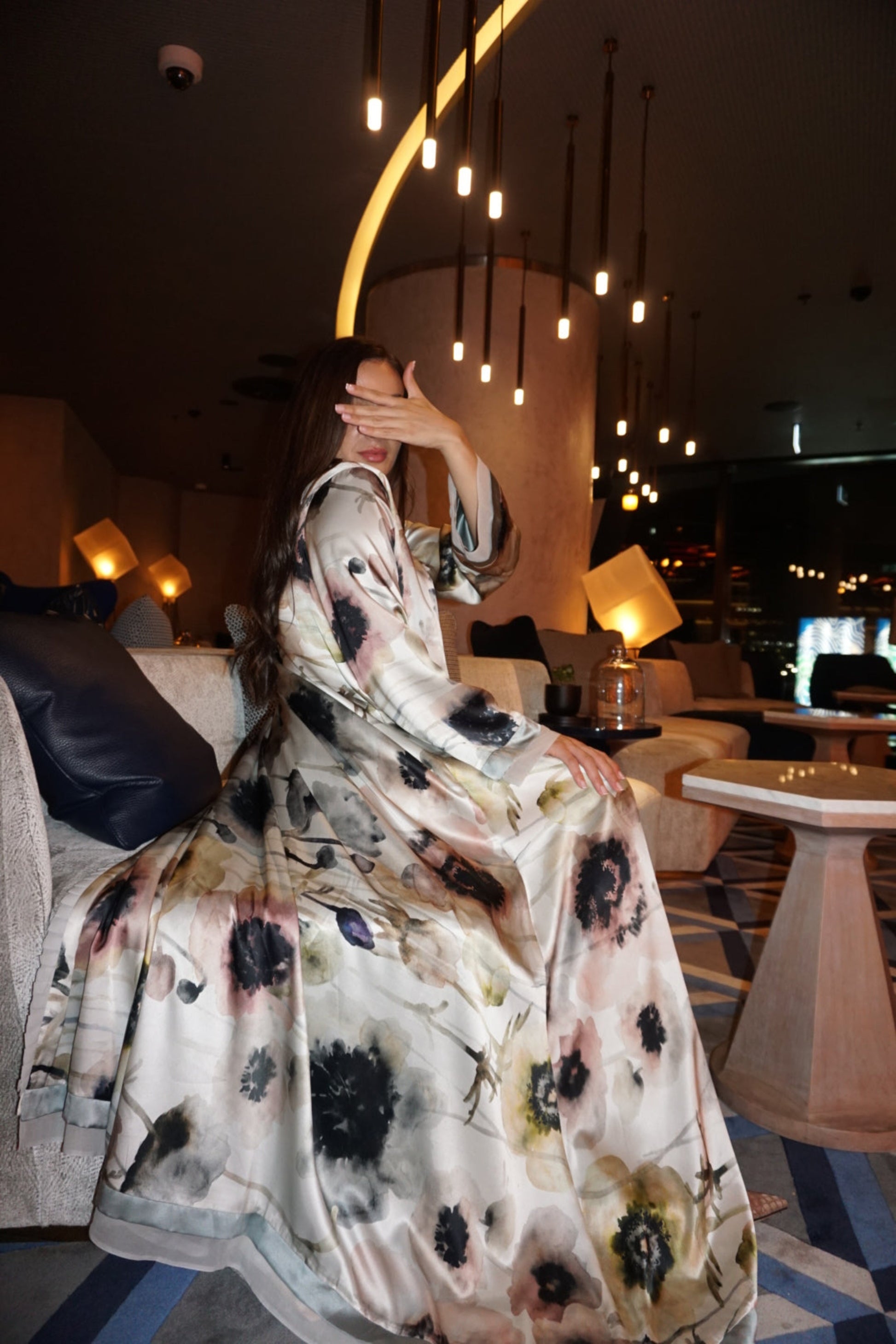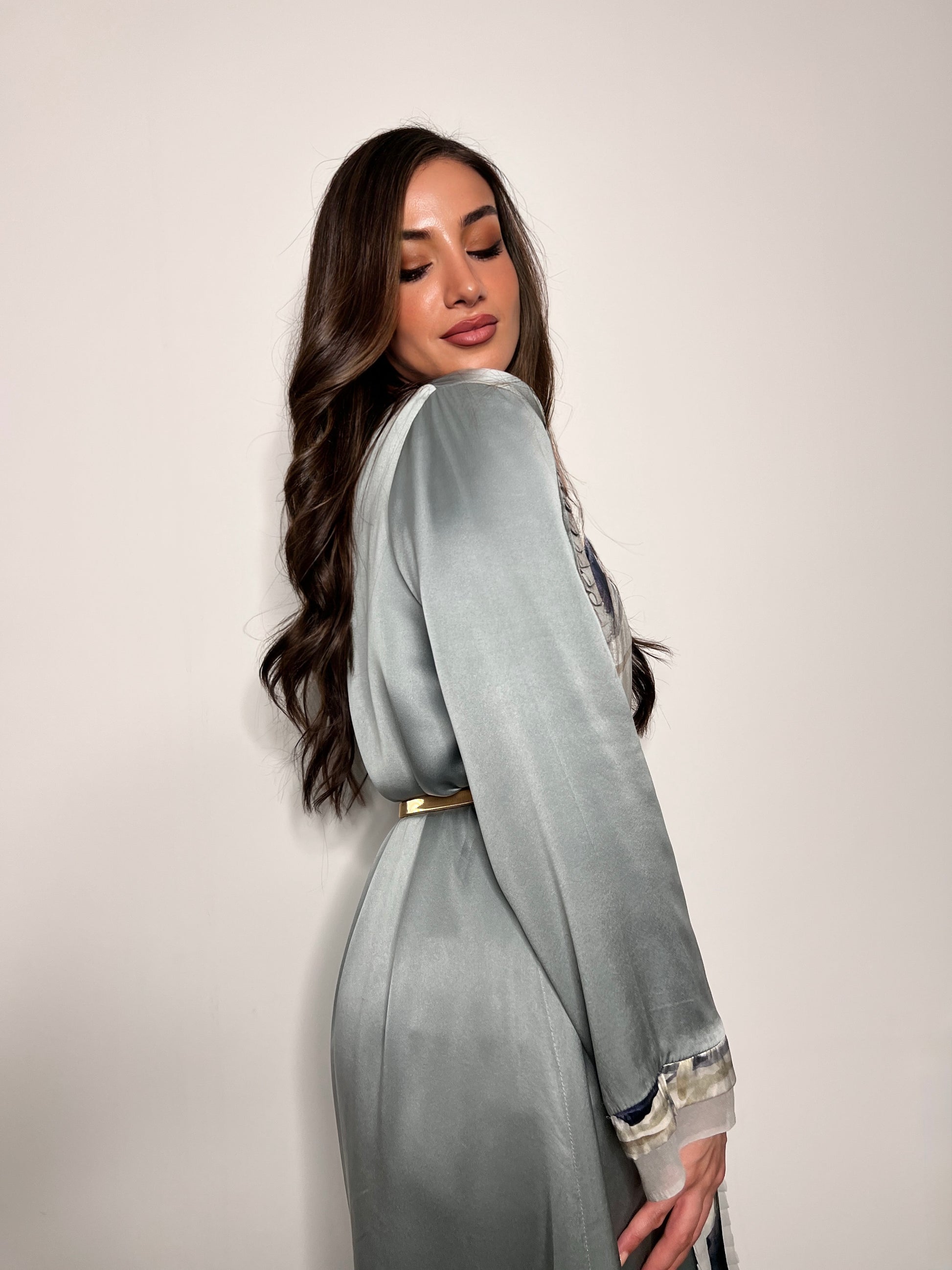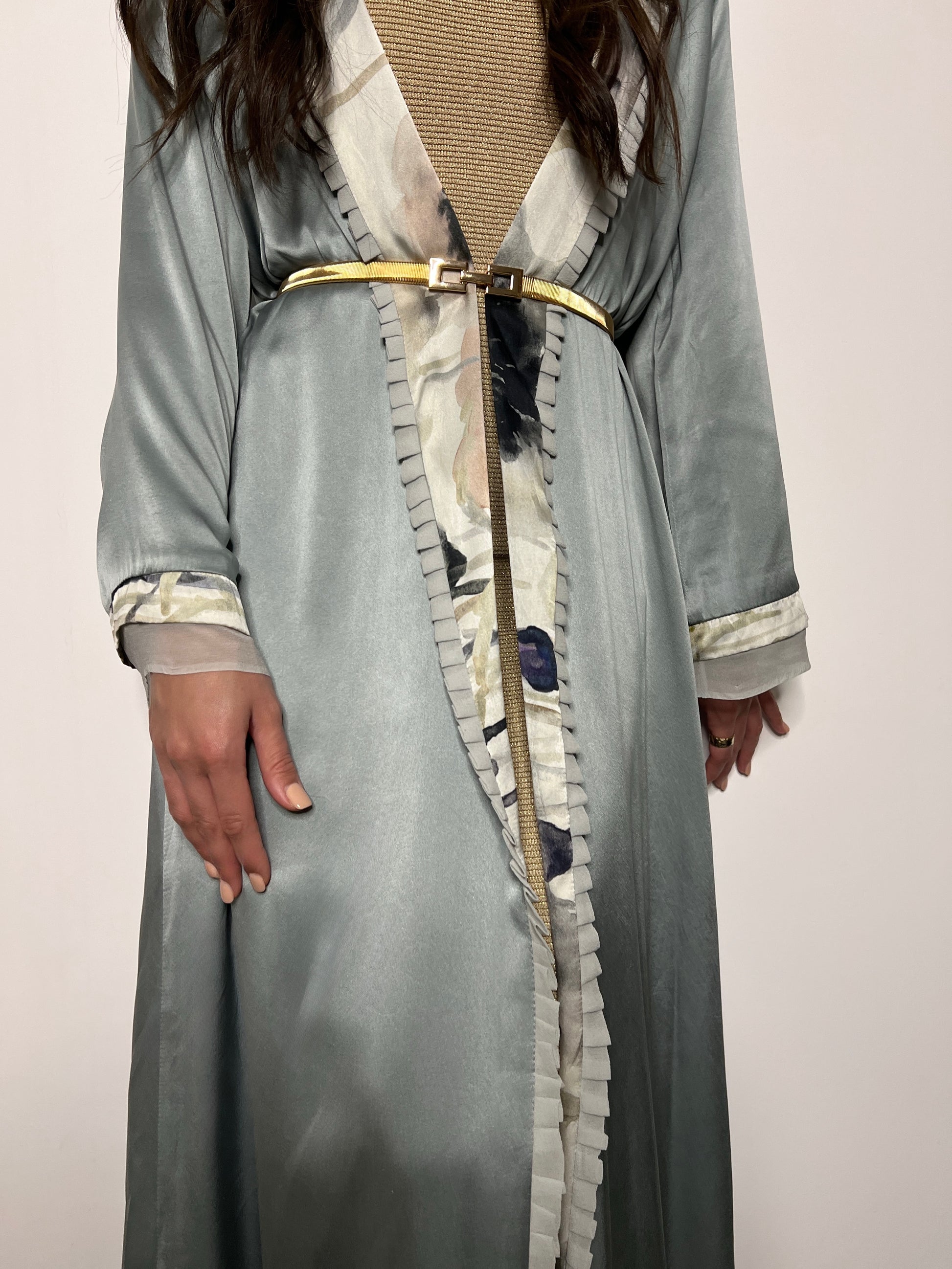 Expertly crafted, this Reversible Japanese Silk Abaya features a soft pastel blue material on one side and a beautifully hand-painted watercolor print on the other. With its pleated edging, it's the ideal choice for any special occasion.