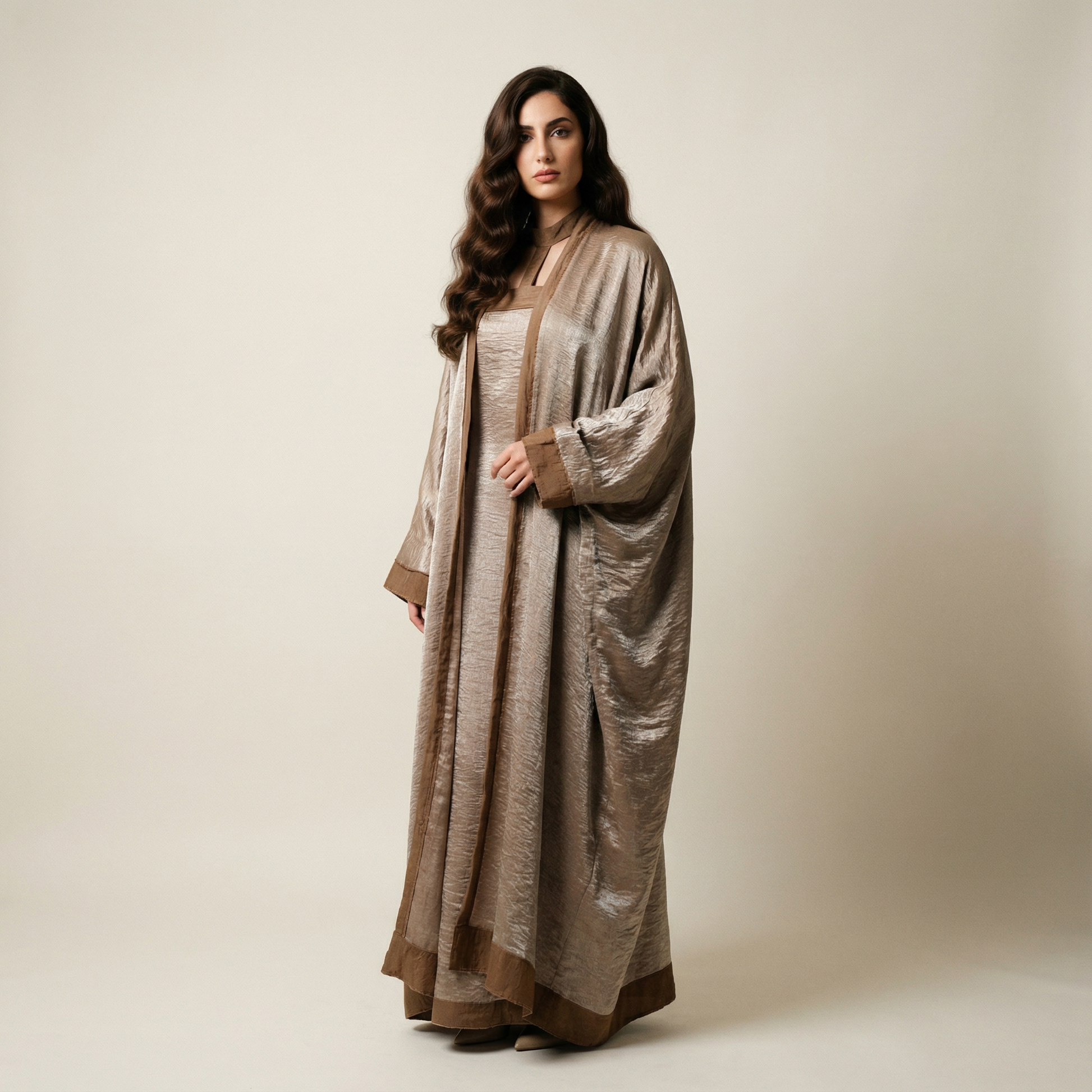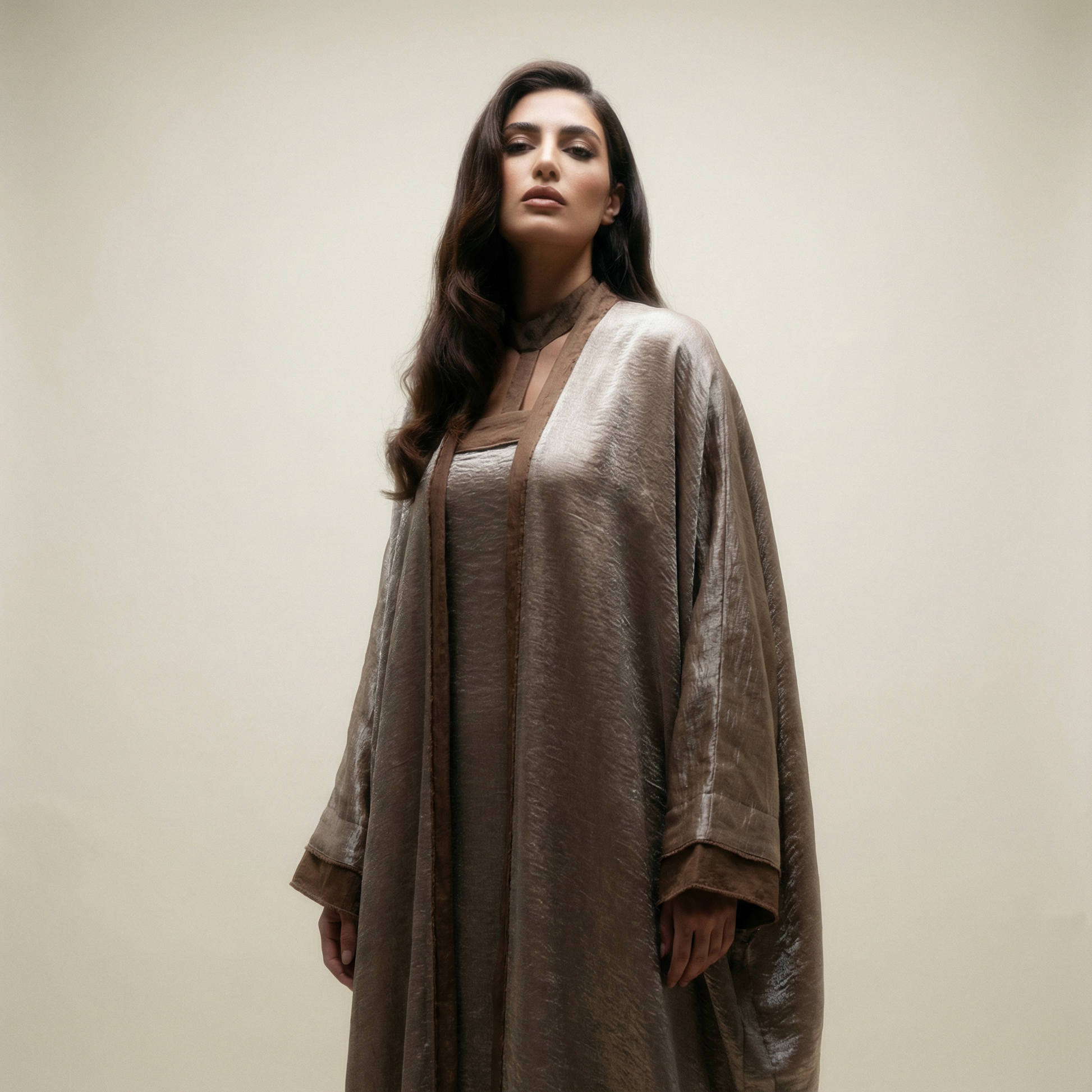 This abaya is created with a sophisticated pastel pink velvet and embroidered with the Saphrouge iconic symbol along the back.